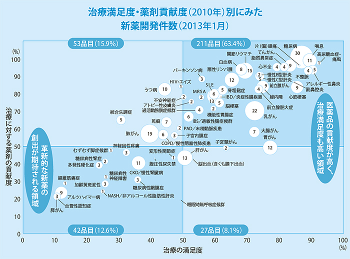 治療満足度・薬剤貢献度(2010年)別にみた新薬開発件数(2013年1月)