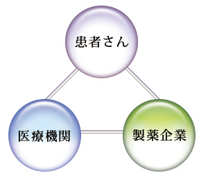「患者さん」「医療機関」「製薬企業」3者が協力して治験を行うことで、新しいくすりが誕生します。