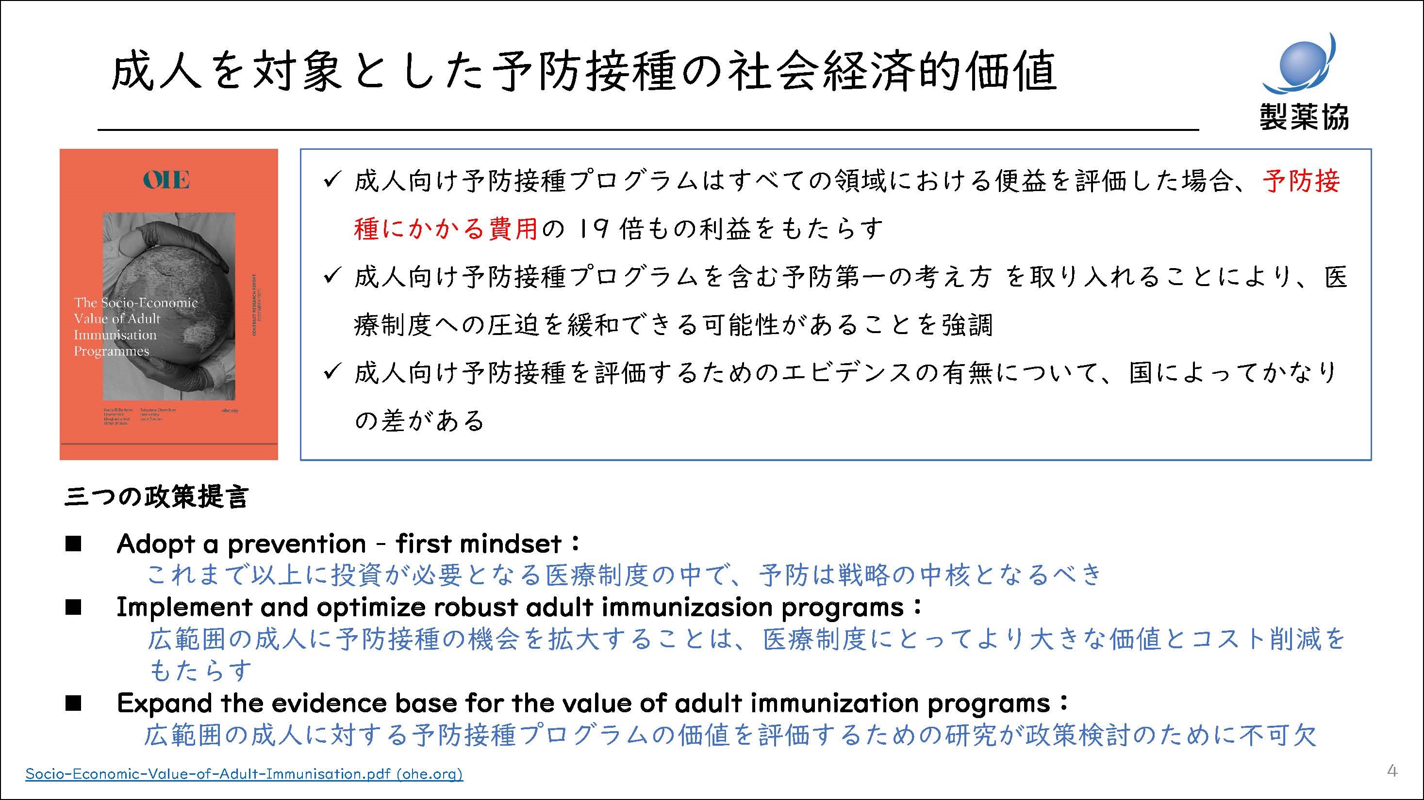 この報告により、成人向け予防接種プログラムを含む予防第一の考え方を取り入れることで、医療制度における、成人の予防接種プログラムを充実することによる価値が、世界的にも注目されています。