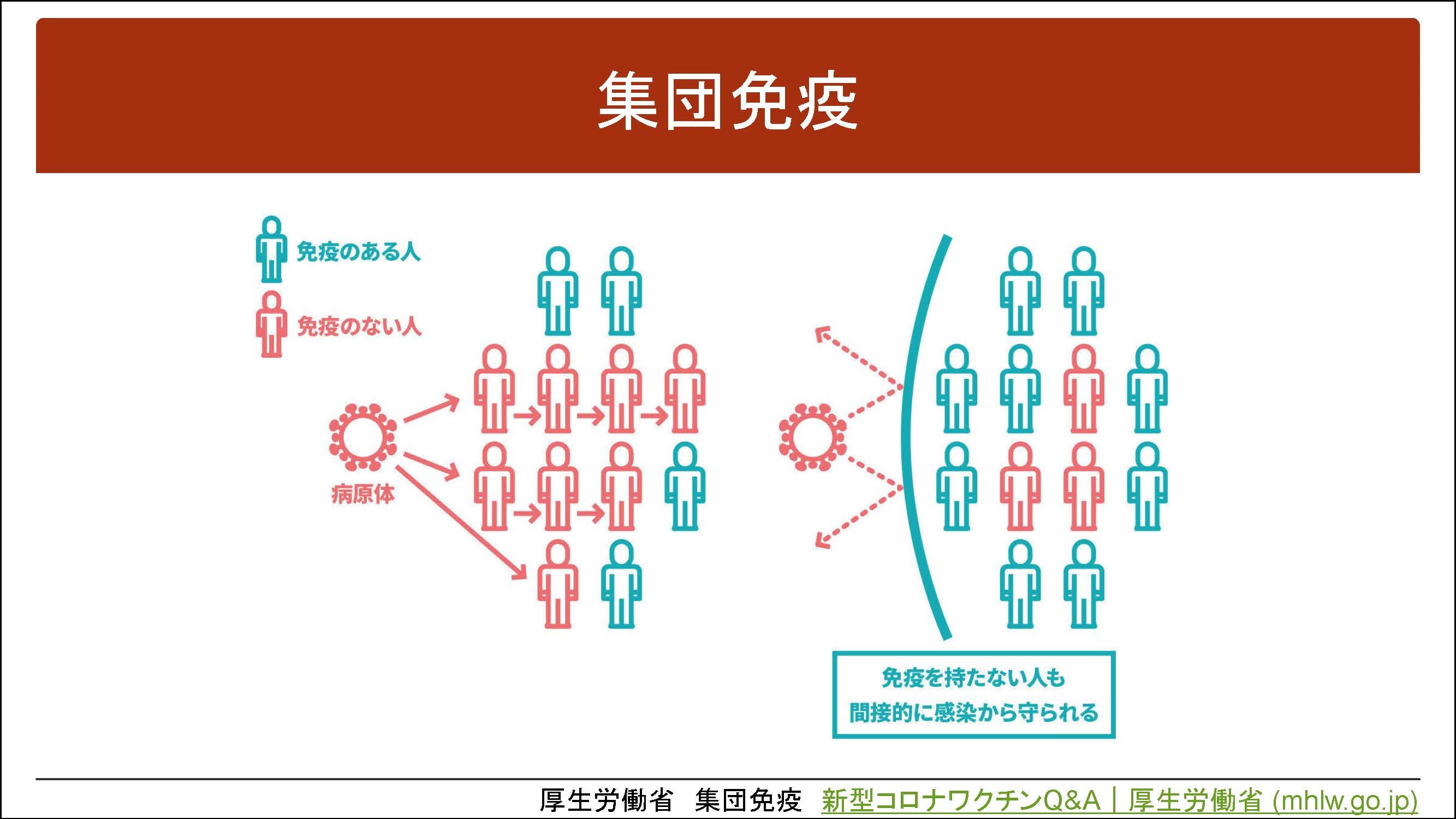 社会全体で予防接種を受けることで集団免疫が生まれます。社会の中で多くの人が免疫を持たない状態だと、病原体は感受性のある人に広がってしまいます。しかし、多くの人が予防接種を受けている社会では、社会の中に免疫を持たない人がいたとしても病原体からそのような人たちのことを守ることができます(図2、集団免疫)。ワクチンを子どもだけでなく大人も接種することによって、社会全体で免疫を作るという考え方が非常に重要です。