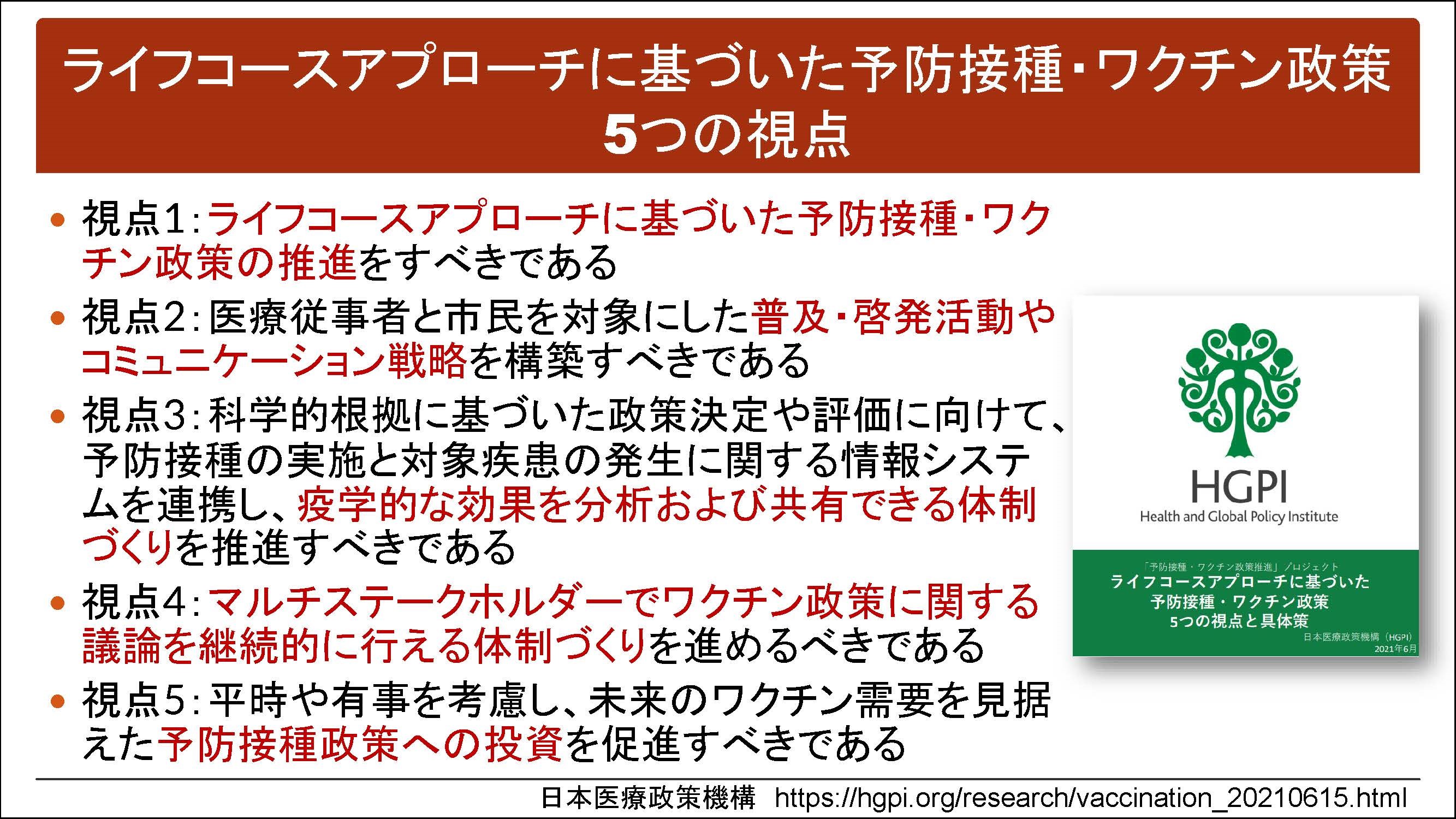 1点目は、「Life course approachに基づいた予防接種・ワクチン政策を推進」すべきであるということです。2点目は、医療従事者と市民を対象にした「普及・啓発活動やコミュニケーション戦略」を構築することで、情報を継続的に発信することが重要です。現在、国内では、予防接種を受けるための情報が不足しています。メディアを通じた情報発信が特に重要になります。3点目としては、予防接種と対象疾患の発生に関する情報システムの連携、疫学的な効果を分析および共有できる体制づくりが政策決定や評価に重要、という点を挙げています。例えば、高齢者のRSV感染症の患者数の正確なデータは無く、疾病負荷やワクチンの効果を評価するデータが不足しています。サーベイランスを常に行い、データを蓄積・分析することが大切です。4点目は、アカデミアからの発信のみならず「マルチステークホルダーでワクチン政策に関する議論を継続的に行える体制づくり」を進めることが挙げられます。最後に5点目は、平時や有事を考慮し、未来のワクチン需要を見据えた予防接種政策への投資を促進すべきという点になります。