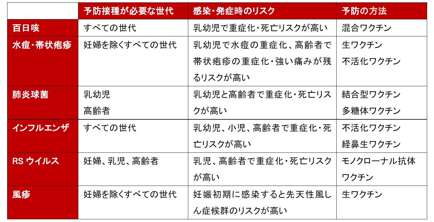 ワクチンの多くはLife course approachに基づいて考えなければなりませんが、今日は6つの病気についてご紹介します(表1)。