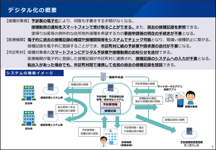 予防接種事務は自治体が実施主体であるため、これまで転出入の際のデータの引継ぎが課題でしたが、デジタル化で転出入前の接種記録を閲覧出来るようになることも大きな利点です。また、匿名化してデータベースとすることで、レセプト情報・特定健診等情報データベース(NDB)のデータや、将来的には電子カルテのデータなどと組み合わせることで、統計的な評価の幅が広がることも期待されます。