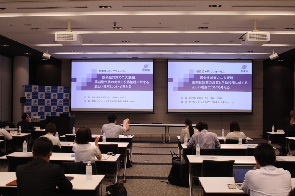 製薬協では、感染症対策の二大課題である「薬剤耐性菌への対策」と「予防接種に対する正しい理解」をテーマに、産官連携で考える機会をご提供するため、2025年9月3日に本フォーラムを開催しました。本フォーラムは二部構成で、第一部では抗菌薬の適正使用や耐性菌拡大防止といったAMR対策の最新動向を、第二部では予防接種に関する正確な情報を「可視化し、届ける」仕組みづくりを切り口に、最新の知見をご紹介しました。