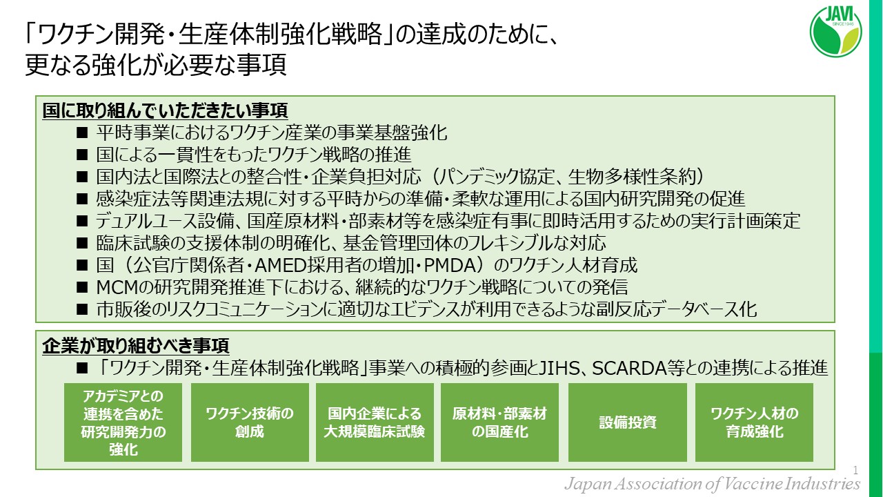 図2に、ワクチン戦略達成のためにさらに強化が必要と考える事項をまとめています。企業は図に示す通り、ワクチン戦略事業への積極的参画と連携を推進する必要があります。国としても平時から持続可能な体制整備を目指すなど一貫性を持ったワクチン戦略を取っていただくことで、より一層企業がワクチン戦略事業へ取り組みやすい環境が整備されると思います。