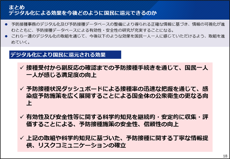 このような接種状況の把握といった一次利用に加え、得られたデータの二次利用もデジタル化の大きな目的です。二次利用については国立健康危機管理研究機構(JIHS)の専門性を含め、どのような活用が可能かをこれから議論しますが、有効性や安全性の評価に活用できると考えています。