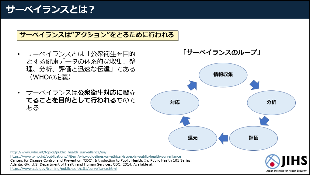 現在、日本での感染症サーベイランスとして最もコアとなる仕組みとして、法律に基づき診断した医師が地方の衛生研究所や保健所を通じてJIHSや厚生労働省へ報告を行う「感染症発生動向調査」があります。