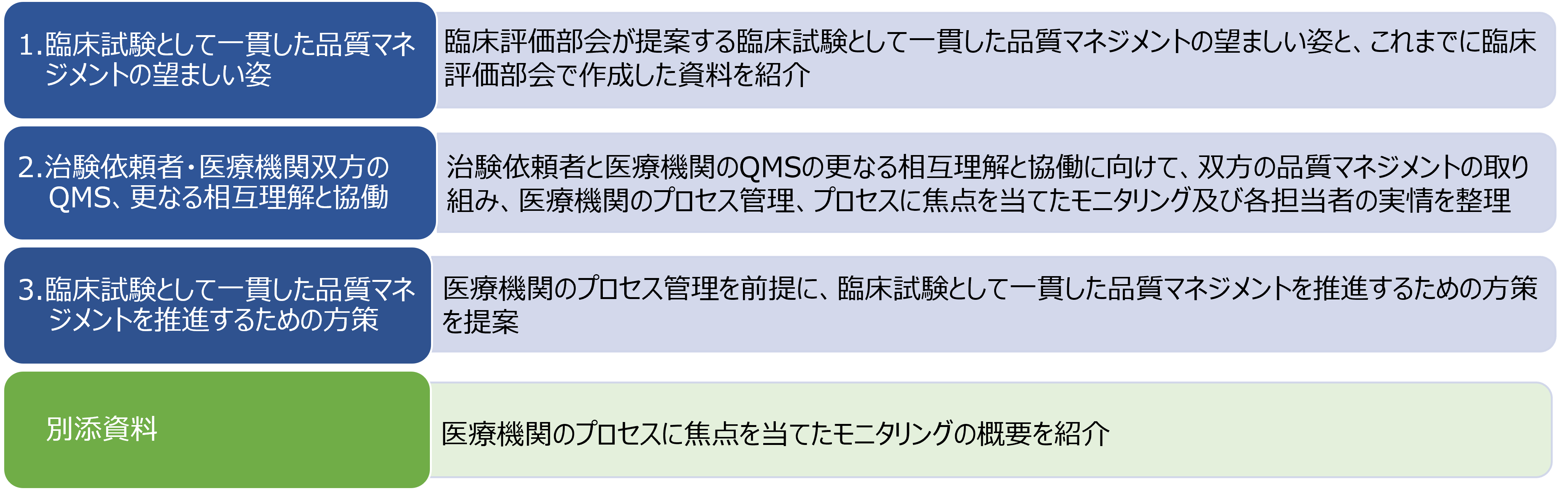 本資料は、臨床評価部会でこれまでに発行した品質マネジメントに関する資料を用いて構成しています。過去の資料の詳細は以下リンク先をご参照ください(「医療機関のプロセス管理を考慮したモニタリング」については製薬協ウェブサイトで公開していないため、上記の別添資料をご参照ください)。