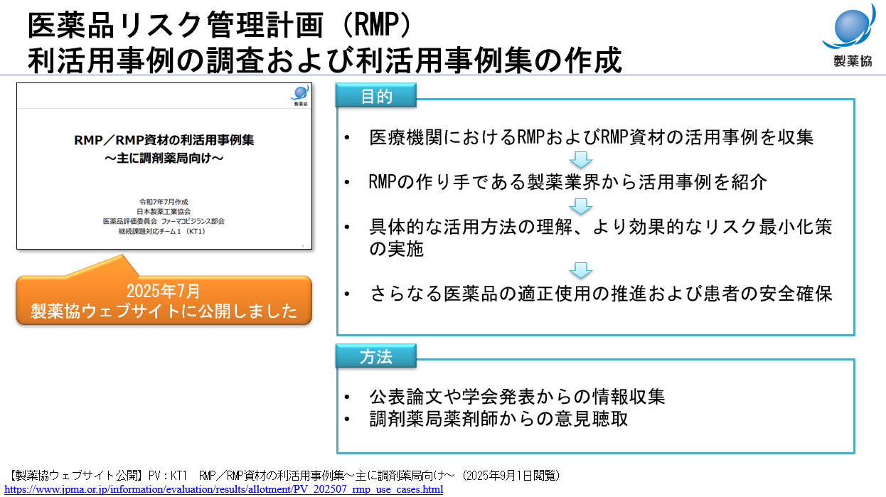 令和6年度の診療報酬改定により、RMPの追加のリスク最小化活動として作成・配布される資材(RMP資材)を用いて、当該患者に対して安全性に関する説明を行った場合に特定薬剤管理指導加算が算定できるようになり、調剤薬局薬剤師にRMPやRMP資材が広く認識されるようになった。一方で、「RMPを活用しない理由」として、「具体的にどのように活用するのかわからない」や「活用する機会がない」といった声も少なくない状況である。そこで、日本製薬工業協会 医薬品評価委員会 ファーマコビジランス部会 継続課題対応チーム1(KT1)では、論文や学会にて発表されている情報、ならびに任意でご協力いただいた調剤薬局薬剤師へのヒアリングにより、RMP/RMP資材の利活用事例を収集し、2025年7月に公開した。