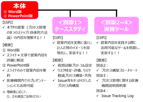 本体は、スライド+文章で提案内容を解説した本体① Word版、スライドに提案内容を要約した本体② Power Point版の2種類を作成している。医療機関の状況に応じて適宜活用いただきたい。
