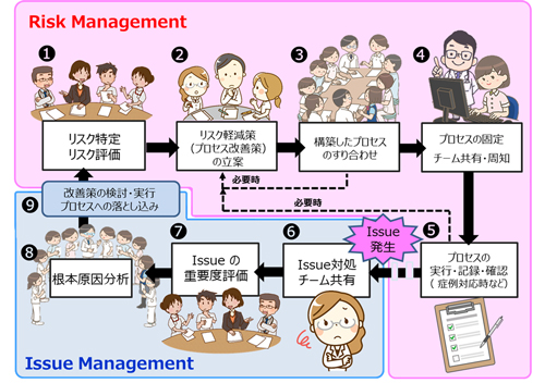 本書では、医療機関が行うプロセス管理の望ましい姿をRisk ManagementとIssue Managementからなる“9つのステップ”および“「誰でも」「正しく」「実行可能」な方法論”として提案している。
