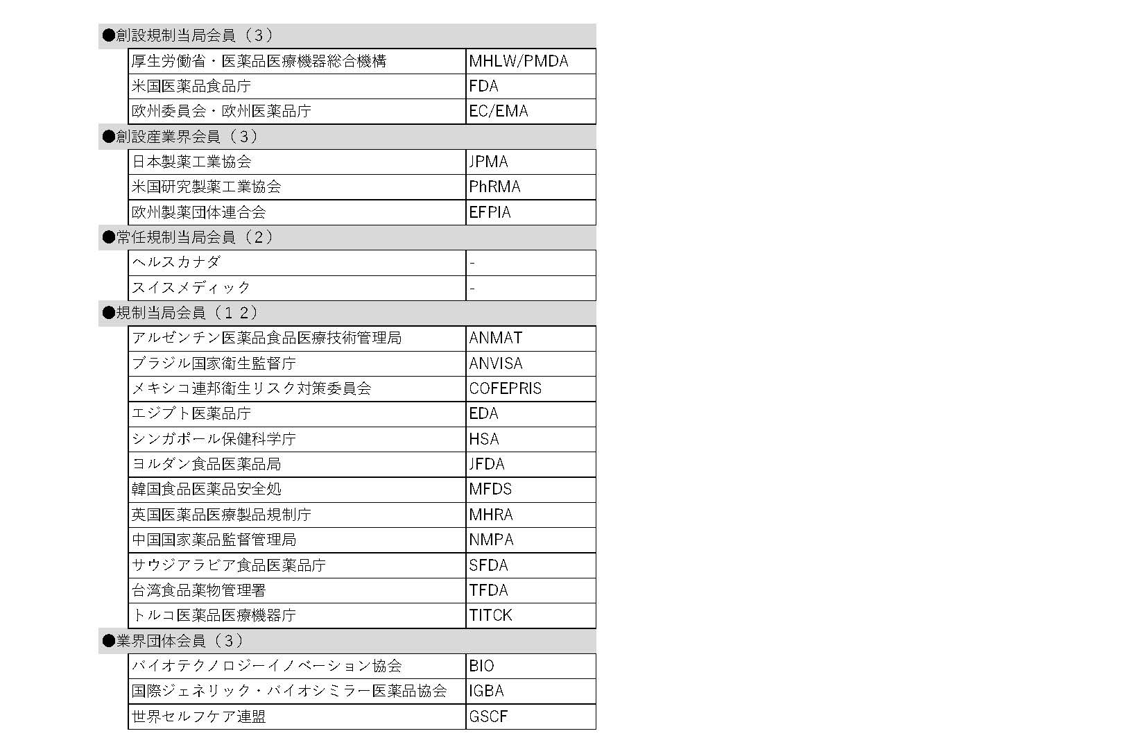 ※2ブラジル国家衛生監督庁(ANVISA)、アルゼンチン医薬品食品医療技術管理局(ANMAT)、メキシコ連邦衛生リスク対策委員会(COFEPRIS)、エジプト当局(EDA)、シンガポール保健科学庁(HAS)、ヨルダン食品医薬品局(JFDA)、韓国食品医薬品安全処(MFDS)、英国医薬品医療製品規制庁(MHRA)、中国国家薬品監督管理局(NMPA)、サウジアラビア食品医薬品庁(SFDA)、台湾食品薬物管理署(TFDA)、トルコ医薬品医療機器庁(TITCK)、バイオテクノロジーイノベーション協会(BIO)、世界セルフケア連盟(GSCF)、国際ジェネリック・バイオシミラー医薬品協会(IGBA)