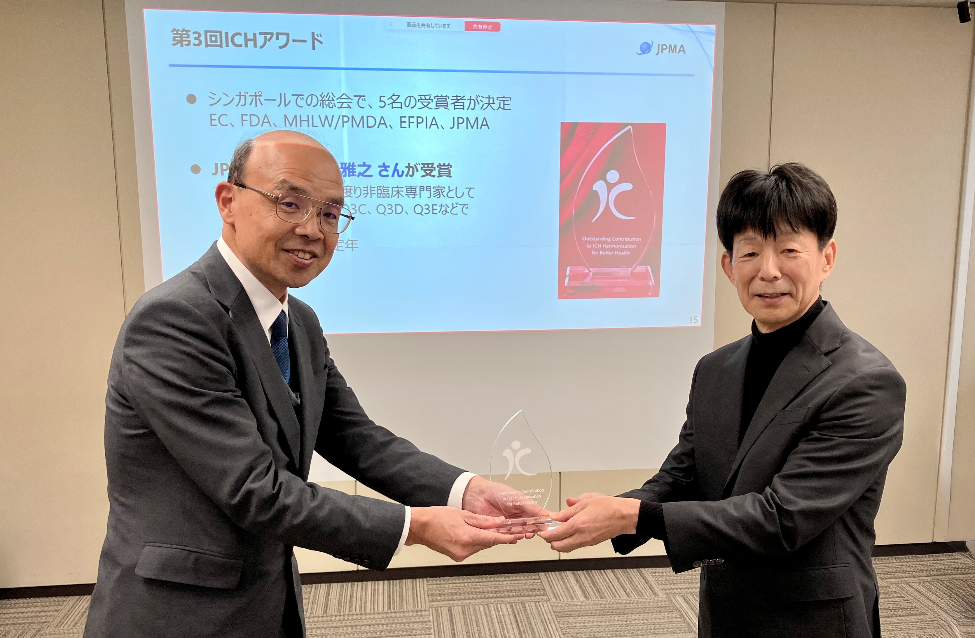 「ICHアワード」は、ICHガイドラインの検討においてリーダーシップを発揮し、多大な貢献をした専門家に授与されます。3回目となる今回は、各団体からの推薦に基づき5名の専門家が受賞し、総会でICHアワード受賞式が行われました。日本からは当局側1名、業界側1名の2名が受賞しています。業界側の受賞者は、製薬協 安全性領域専門家の三島 雅之 氏(元医薬品評価委員会所属)が受賞し、ICHの専門家作業部会における重要なリーダーシップや持続的な貢献が認められました。