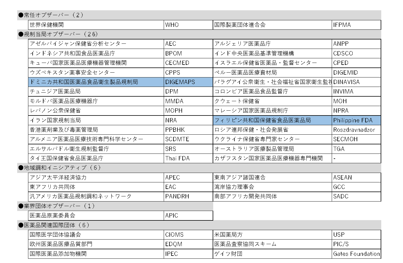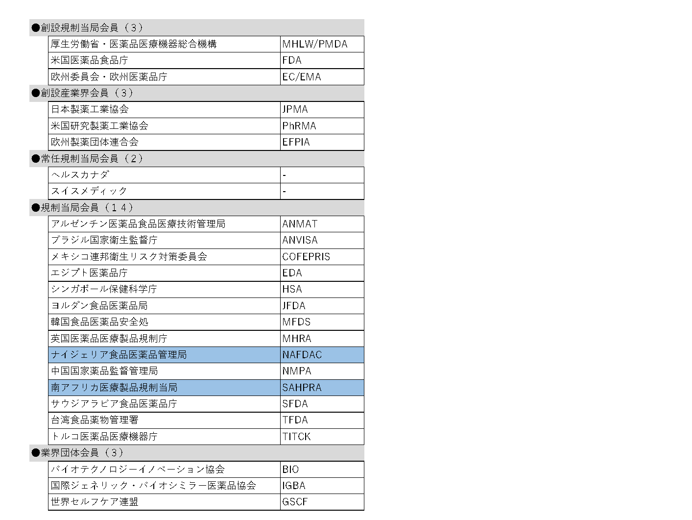 ※3アルゼンチン医薬品食品医療技術管理局(ANMAT)、ブラジル国家衛生監督庁(ANVISA)、メキシコ連邦衛生リスク対策委員会(COFEPRIS)、エジプト医薬品庁(EDA)、シンガポール保健科学庁(HSA)、ヨルダン食品医薬品局(JFDA)、韓国食品医薬品安全処(MFDS)、英国医薬品医療製品規制庁(MHRA)、ナイジェリア食品医薬品管理局(NAFDAC)、中国国家薬品監督管理局(NMPA)、南アフリカ医療製品規制当局(SAHPRA)、サウジ食品医薬品庁(SFDA)、台湾食品薬物管理署(TFDA)、トルコ医薬品医療機器庁(TITCK)、バイオテクノロジーイノベーション協会(BIO)、世界セルフケア連盟(GSCF) 、国際ジェネリック・バイオシミラー医薬品協会(IGBA)
