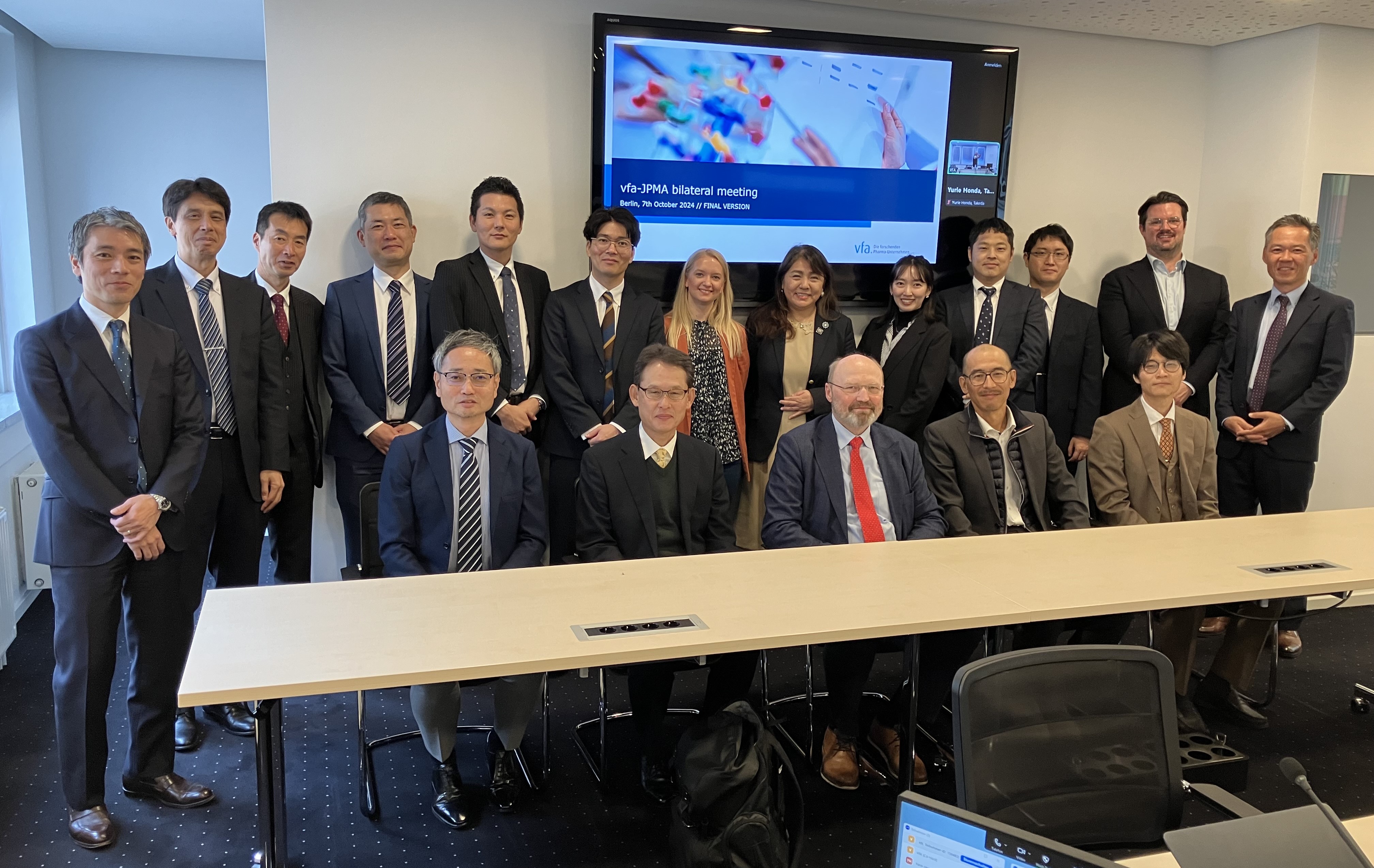 製薬協国際委員会欧米部会では、欧米の政府・製薬団体と協調し、国際的課題の解決を図る活動の一環として、欧州の製薬団体との定期会合を毎年実施しています。2024年のドイツのvfaとの定期会合は、10月7日に対面とオンラインのハイブリット形式にて開催されました。会の後半には、定期会合では初めてvfaとフリーディスカッションを実施した後、在独日本大使館を訪問し書記官との面談も行われました。