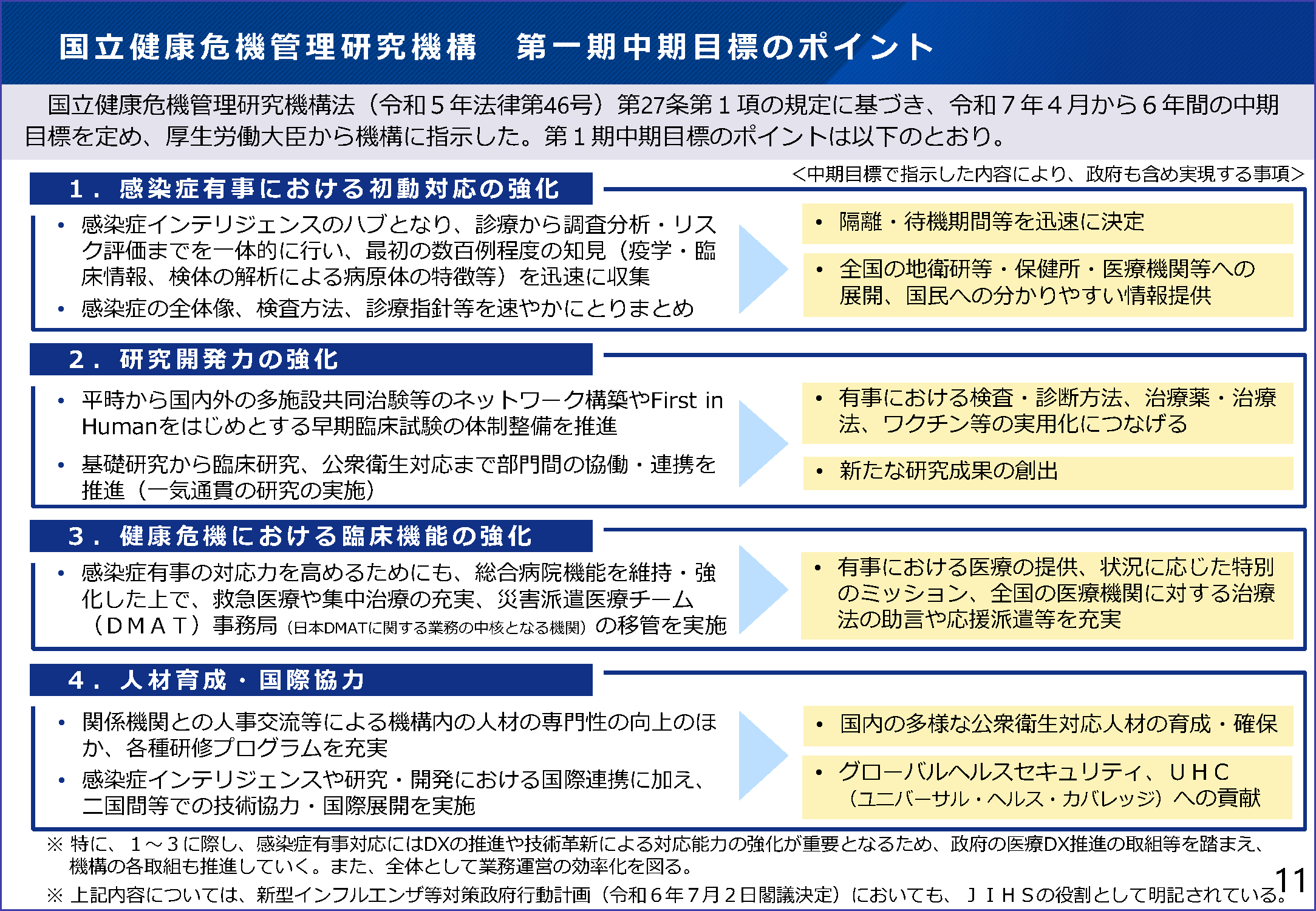 JIHSの主要な目的は、感染症の予防及び感染症の患者に対する医療に関する法律(感染症法)改正により強化される全国的な情報基盤、ならびに基礎から臨床までの一体的な研究基盤の構築、そして外部組織との連携を通じて質の高い科学的知見を獲得し、それを統括庁や厚生労働省の感染症対策部に迅速に提供することです。この組織は特別の法律(国立健康危機管理研究機構法)に基づき、政府の全額出資により設立され、厚生労働大臣が定める中期目標に基づき中期計画を作成し、業務を推進します。