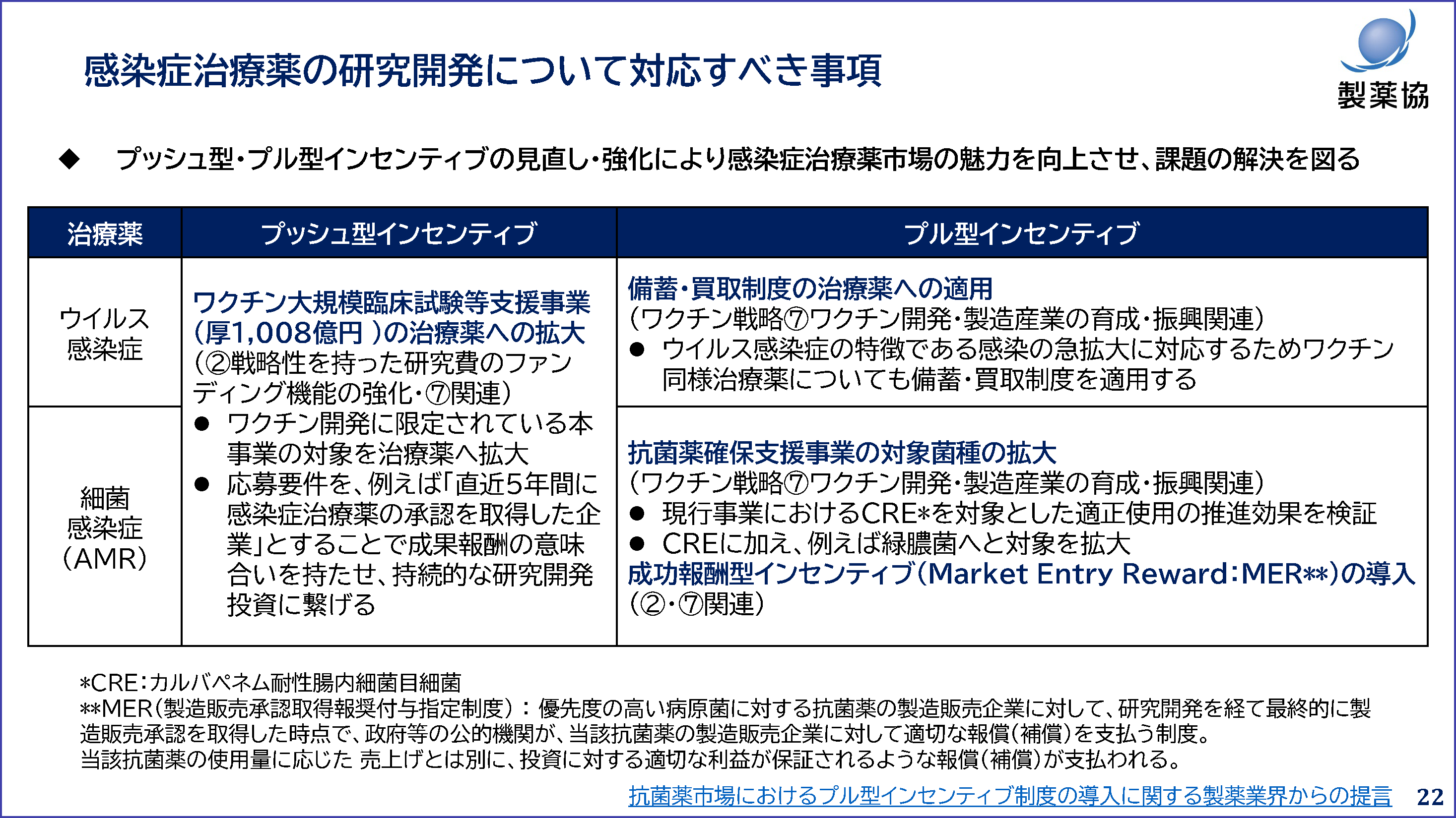 市場原理だけでは持続的な抗菌薬開発は困難、研究開発段階への支援(プッシュ型)に加え、製品化後の買い上げや報奨(プル型インセンティブ)が不可欠。プッシュ型支援のみでは企業の倒産を防げなかった米国での事例もあり、政策的な市場性改善が必要。