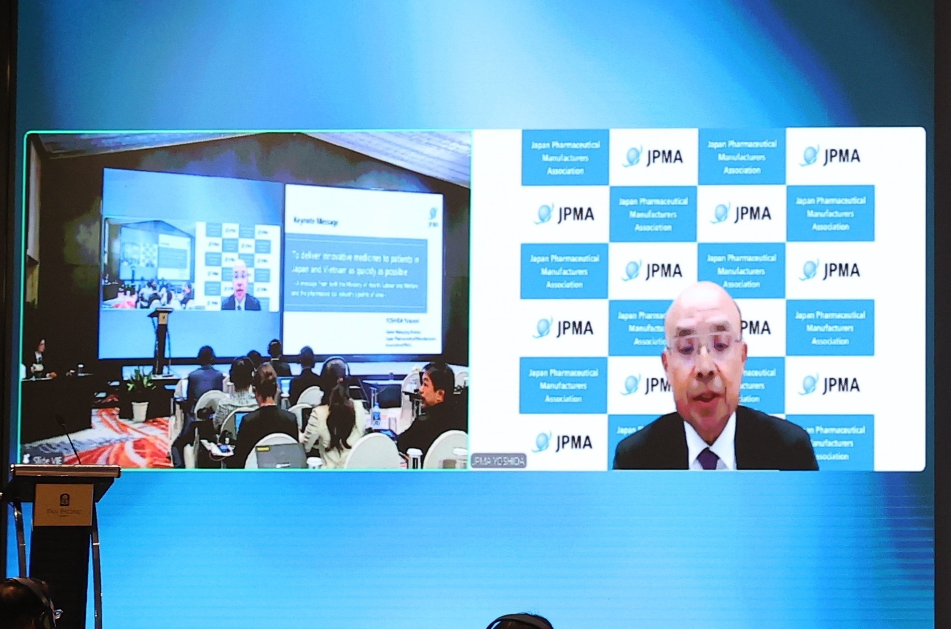 製薬協の吉田易範専務理事 登壇の様子