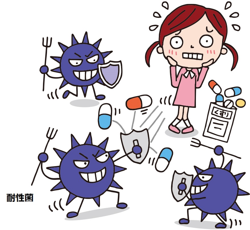 悪さをする細菌がいない時に抗菌薬(抗生物質)を飲むと、体内にいる細菌が、その抗菌薬(抗生物質)に対して耐性[薬に打ち勝つ性質(せいしつ)]をもってしまう。