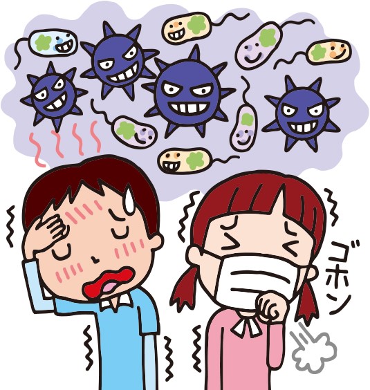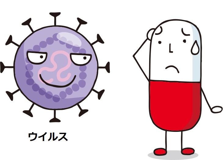 (ウイルスをやっつけるのは、抗ウイルス薬[抗インフルエンザ薬など]。)