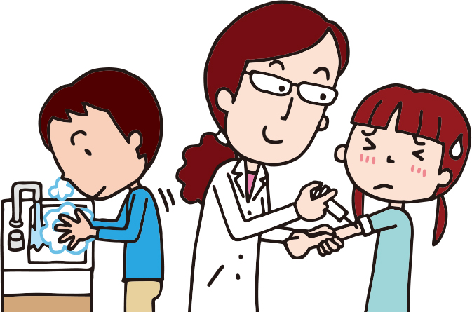 手洗(てあら)い、うがい、予防接種(よぼうせっしゅ)など、病気にならないように自分の体を守る。