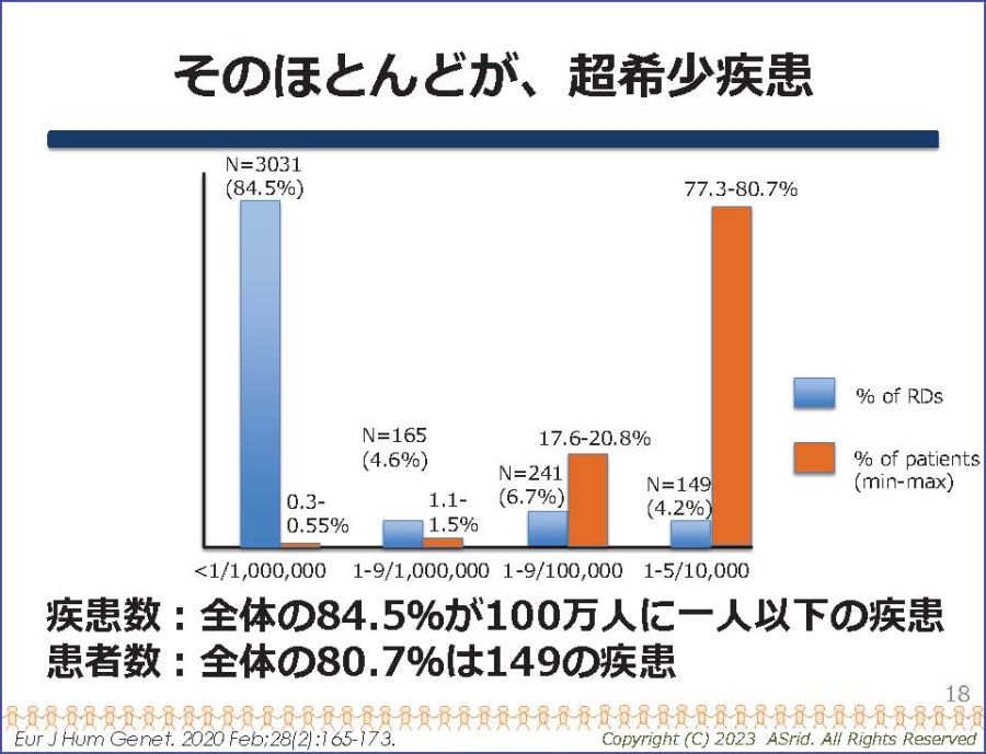 次に希少疾患についてご紹介します。希少疾患は1疾患あたりでみると患者数が非常に少ないですが、すべての希少疾患をあわせると全世界で約3億人、世界人口の約5%が影響を受けています。米国国立衛生研究所(NIH)の発表では6,000弱の希少疾患があり、サブタイプを含めると約2-3万あります。これは公衆衛生上、非常に大きなインパクトです。