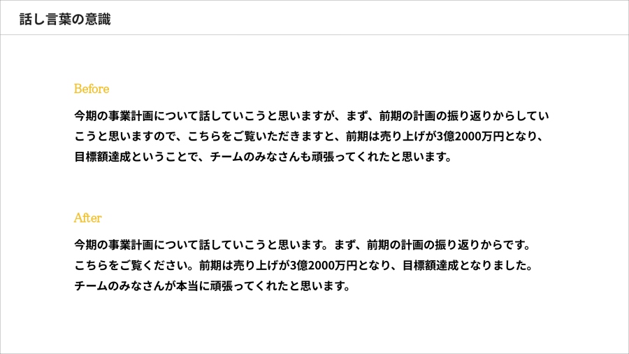 図2のBeforeとAfterを読み比べると、同じ内容でも一文を短くするだけで聞きやすさが大きく変わることを体感いただけると思います。話し言葉では、なるべく文章を区切りながら話をしていくことが重要なポイントです。