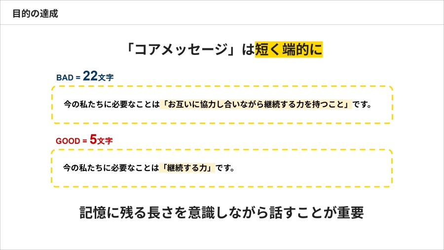 図3にあるように、コアメッセージは、だいたい5~10文字程度に収めるのが効果的です。たとえば、「今の私たちに必要なのは協力しながら継続する力を持つことです」といった複数のメッセージが入っていると、聞き手によって受け取り方が異なります。これを「継続する力」と明確に言い切ることで、聞き手に一番伝えたいことが明確に伝わります。