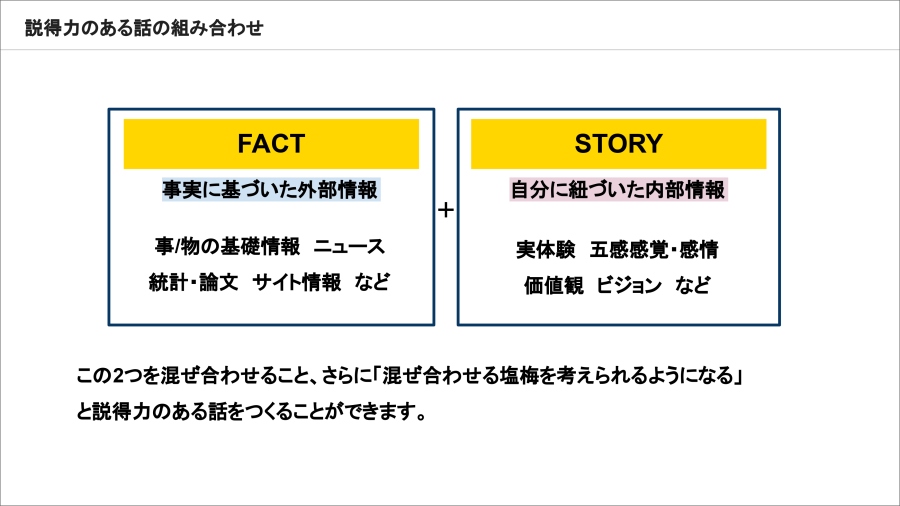 説得力のある話をつくるとき、私たちはファクトとストーリーを組み合わせることを大切にしています。ファクトはニュースや統計、論文、基礎情報などの「外の情報」。ストーリーは実体験や感情、価値観など「自分の中の情報」です。この二つの混ぜ方で、聞き手に届く印象は大きく変わります(図2)。