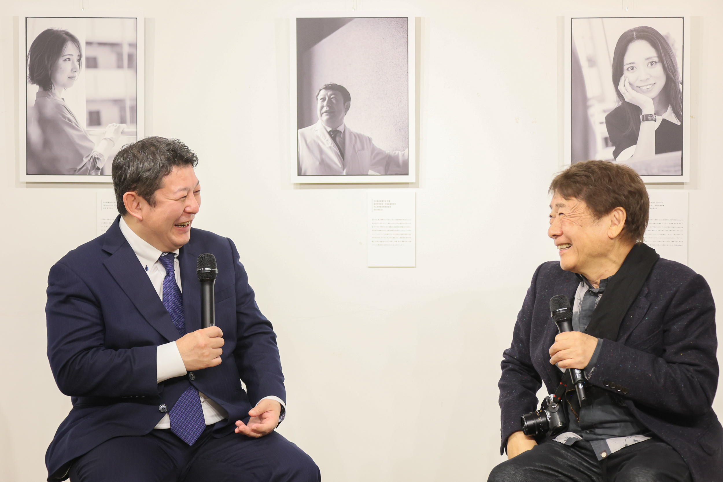 最初にハービー・山口氏から「医療従事者や、サポートを行う方々は、神に近い存在だと思っています。生きている限り希望を持って、明日よりもっといい世界を作っていきたいという思いは一生続けていきたいと思います」というメッセージに、古川氏は「私たちの病院に来てくれる患者さんの不安を少しでも取り除けるように、サポートしていきたい、そして新しい治療を提供したいと言う思いがあります。患者さんが少しでも笑顔になってくれるようにしたいです」、半澤氏は「私も含めて被写体になった皆さんは、目指している方向は一緒ですが、立場や価値観、生き方が違う、それぞれの存在がハービーさんの写真によってすごく強く肯定されたと思います。この写真展を通して、この人とは考え方が近いとか、こういう活動もあるんだということを多くの方に知っていただければと思います」、水田氏は「病いを得ても、その人らしい生き方やユニークさは失われず、ハッとするようなきらめく瞬間をハービーさんが切り取ってくれたと皆さんの写真を見て思いました。それぞれの立場は異なりますが、彩りあふれたカラフルな世界がこのモノクロの写真展に溢れています。ぜひ実際に足を運んでください」と、今回の写真展への期待や、それぞれの分野での発展を望んでのコメントがありました。