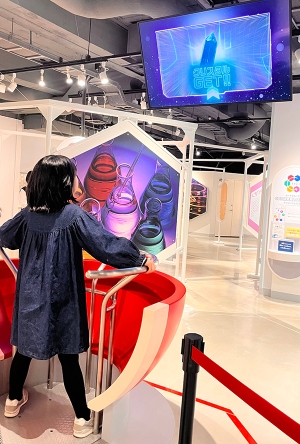 今回の新展示の目玉となるカプセル型外観のアトラクションです。体重を前後左右にかけて、画面を操作して問題に答えながら、正解するとクリスタルがもらえるクイズゲームとなっています。設問にはくすりの吸収や排泄、免疫やワクチン、オーバードーズへの注意喚起など、複数のテーマが用意されています。