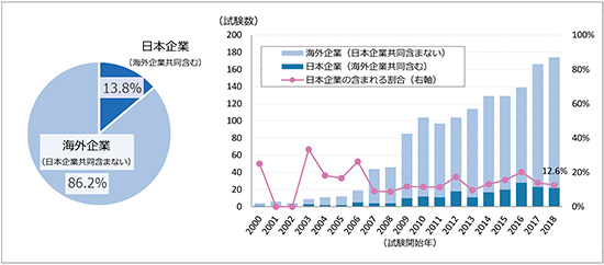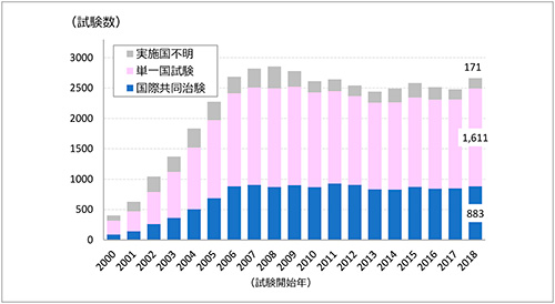 国際共同治験、単一国試験ともに、2000~2006年にかけ試験数が急増し、その後2018年まで、国際共同治験が800~900試験、単一国試験が1400~1600試験といずれも大きな変動はなく、横ばいで推移していました。