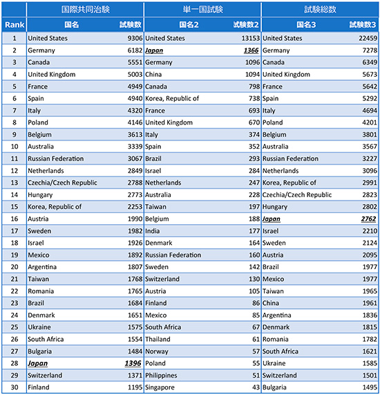 表1 国際共同治験/単一国試験の実施試験数の上位30ヵ国