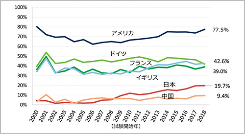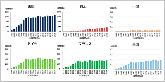図3 主要国の国際共同治験試験数の年次推移(試験開始年:2000~2018年)
