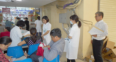 予備調査の内容としては、患者さんがどのように薬を処方されているのかを観察するとともに、患者さん一人ひとりの薬に対するニーズはなにか、現状をどのように感じているのか等について、聞き取り調査を実施することです。調査を実施したバックマイ病院(BMH)は、ベトナムの首都ハノイにあるベトナム三大中央病院の一つで、ベッド数が2000床以上もある大病院であり、NCGMとは長年協力関係にあります。こうした大病院には、比較的重症度の高い患者さんが多いのですが、中等度の患者さんでもより良い医療を受けるために来院するので、院内は患者さんやその家族で溢れており、診察までの待ち時間も場所が足りないので廊下で寝そべっていたり、入院患者も1つのベッドを複数の患者さんが共有していたりします。医療スタッフに対する患者さんの数があまりに多過ぎて、患者さん一人ひとりへの対応にそれほど時間をかけていられないことは明白であり、薬も処方せんに沿って提供はされるものの、窓口で使用方法の説明等は行われていませんでした。当グループがNCGM薬剤部と協力して160名近くの外来患者さんを対象に聞き取り調査を行った結果からは、約3割の患者さんにおいて処方された薬が余る、あるいは足りなくなるという事象が発生すること、全体の半数以上が自分の服薬している薬の「効能効果」「飲み方」「副作用」等を理解していないこと、調査した患者さんの2/3は今以上の服薬指導を希望していること、また、希望していない1/3の患者さんについても、薬の理解度が必ずしも高いわけではないこと等がわかりました。