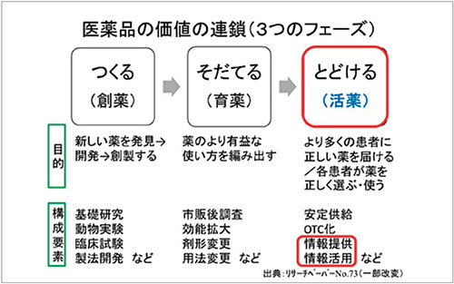 2019年5月に公表したリサーチペーパーNo.73『「医薬品の価値」をあらためて考える』の中で、医薬品の "価値の連鎖"として「価値をつくる(創薬)」→「価値をそだてる(育薬)」→「価値をとどける/いかす(活薬)」の3つの段階を考え、「活薬」=創製された医薬品の価値を適切にお届けし適切に使用していただくことにより医薬品の効能・効果を正しく発揮させることの結果として、その価値が顕在化され最大化されると記載しています(図1)。