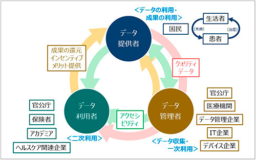 医療ヘルスケアの「データエコシステム」で主役となるのは「デジタル化された患者・生活者のデータ」です。電子カルテや画像データ等の医療情報に始まり、ゲノム情報、健診・検診データや生活・行動データなどのPersonal Health Record(PHR)も含めた多様な情報が対象となります。これらのデータが実際に使えるデータとして生み出されるためには、利用目的に応じた質の確保や、連結・相互運用の可能性を高めるとともに、データへのアクセス性を高め、データから創出された価値や成果が速やかにフィードバックされる環境を整備することが必要となるでしょう。