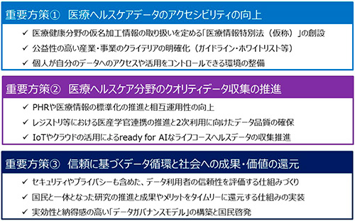 こうした視点から、本報告書では、下記の3つの観点を重要な方策としてまとめています(図5)。こうした取り組みにより、データ駆動型ヘルスケアの実現がさらに進展していくことが期待されます。詳細な情報は、報告書本編をご覧いただければと思います。