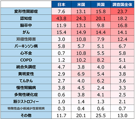 家族介護者の現状を国および疾患別に調査した報告※4によると、日本、米国、英国で比較しても家族介護者が実際に介護を行っている疾患の割合はそれぞれ異なっています(表1)。特に超高齢社会である日本は、認知症患者の介護を行っている人の割合が他の国に比べて高くなっています。また、高齢者に多い疾患が上位にはありますが、成人や小児期で発症する疾患も一定割合に及ぶことがわかります。さらに、同調査によると家族介護者の健康関連QOLやうつ症状スコアは、介護をしていない人と比較して悪化していることが報告されています。