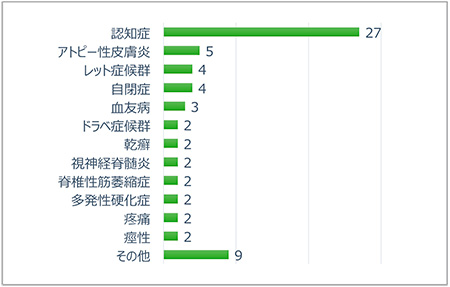 次に、対象疾患別での介護者アウトカム指標あり試験数を図2に示しています。認知症が27件(全体の約4割)と最も多く、次いでアトピー性皮膚炎、レット症候群、自閉症が多いものでした。要介護者の視点から考えると、主に高齢者が介護対象である認知症だけでなく、小児期から中長期のケアやサポートを必要とする疾患も確認されました。また、医薬品の観点から見ると、スペシャリティ領域の疾患が多い傾向でした。さらに、英国NICEのHST※7評価ガイダンスでも対象となった希少・難治性疾患(ムコ多糖症、筋ジストロフィー等)も含まれていました。