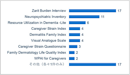 続いて、評価項目に記載されていたアウトカム評価ツールを抽出し、図3に示しました。1つの試験に複数のアウトカム評価ツールの記載があった場合はそれぞれカウントし、合計70件でした。最も多く使用されていたのは、上述のZaritによって作られたZarit Burden Interview(ZBI)でした。次に多かったのはNeuropsychiatric Inventory(NPI-D)、Resource Utilization in Dementia - Lite Version(RUD-Lite)でした。
