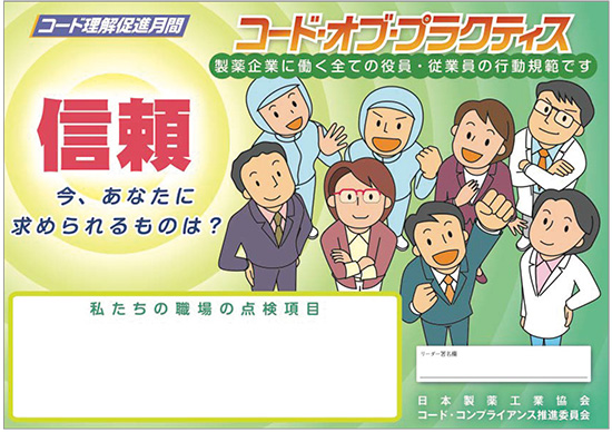 製薬協は、2020年度も11月を製薬協コード・オブ・プラクティス(以下、製薬協コード)の理解促進月間として、取り組んでいくこととしました。2020年度のテーマは「信頼 ~今、あなたに求められるものは?」と定め、改めて会員会社が一体となって製薬協コードの遵守徹底のための社内点検を実施いたします。