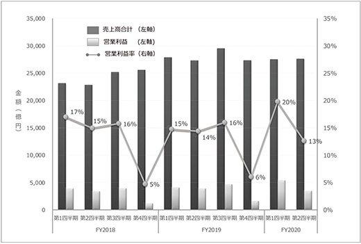 図1 国内製薬企業の四半期別売上高と営業利益率のトレンド