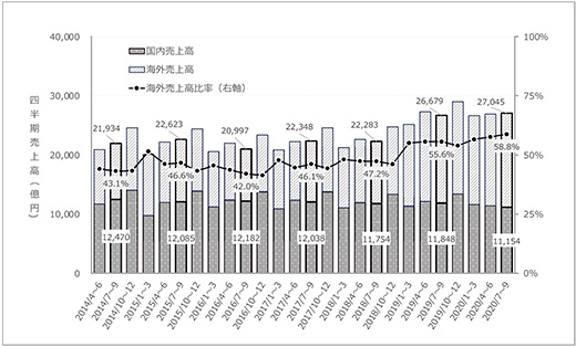今後受診動向が回復基調に転ずるか否か等、市場を取り巻く環境が不透明であることはいうまでもありませんが、4~9月期を経た段階に限ると、パンデミックに伴って業界全体として事業継続への深刻な影響を及ぼす業績へのインパクトはないように見受けられます。さらに連結売上高を構成する国内外売上高の推移を検討したところ(26社のうち、医薬品事業の売上高が総売上高の50%超で調査期間中の海外売上高データが入手可能な16社を集計)、やはりCOVID-19パンデミックによる国内売上高に対する明確なネガティブインパクトは認められませんでした(図2)。