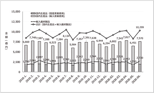 COVID-19が拡大する中、日本ではマスクや防護服といった医療物資の不足が大きな問題となっていました。また、医薬品の一部においても出荷制限がかかる等、供給不安の声があがる時期もありました。医薬品のうち、医療用医薬品に関しても、その生産に必要な原薬等の調達先としていた海外で製造、輸出が滞ったために2020年5月末から7月末にかけて供給不安に陥る可能性のある製品は計14品目を数えましたが、いずれも企業間での調整による欠品回避や、代替薬について各企業が学会と連携し、対応が図られています※4。医療用医薬品全体でみると、図3に示すように医薬品の国内生産額と医薬品の輸入金額の月次推移において、世界で流行が進んだ2020年2月以降も2019年同月と比べて大きな変化は認められず、また、2020年5月から6月にかけて輸入原薬を使用した国内生産製品や輸入最終製品生産の着実な回復がうかがわれており、医療用医薬品の供給面でも、幸いにしてCOVID-19パンデミックによるネガティブインパクトは認められませんでした。