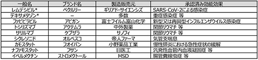 レムデシビルやデキサメタゾンのように、すでにヒトでの使用実績がある薬剤を、本来の治療対象とする疾患以外の疾患の治療に転用する手法、所謂ドラッグ・リポジショニングが活用されています。直近では、抗インフルエンザウイルス剤として承認されているファビピラビル(ブランド名:アビガン)について、そのSARS-CoV-2に対する抗ウイルス効果の期待から臨床試験が進められていましたが、統計学的に有意な症状改善効果が認められ、承認申請が行われた事例※11が挙げられます。国内における主要なドラッグ・リポジショニング活用例を表1に示しましたが、それぞれの既承認適応症や薬理作用が多岐にわたっており、COVID-19の臨床像の多様性と治療の困難さがうかがわれます。また国立研究開発法人理化学研究所と京都大学は共同で、世界最高水準の計算能力を有するスーパーコンピュータ"富岳"を活用し、既存薬2128種の薬剤からSARS-CoV-2に効果を示すことが期待できる薬剤数十種類を選択(そのうち12種類はすでにCOVID-19に対する臨床研究や臨床試験が実施中)することに成功したとの報道※12がされており、その後の評価の進展が期待されるところです。