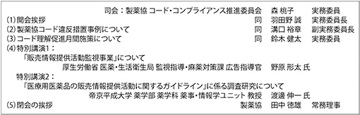 製薬協コード・コンプライアンス推進委員会は2020年9月29日、「2020年度コード管理責任者・実務担当者会」を開催しました。2020年度は新型コロナウイルス禍に鑑み、初めての試みでしたがオンライン形式で開催しました。会員会社72社から、コード管理責任者とコード実務担当者が参加し、表1のプログラムにしたがって実施され、有意義な会となりました。以下、本会の概要を報告します。