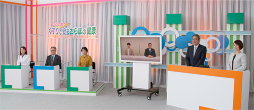 2020年度の収録は、新型コロナウイルス感染症対策のため、例年と異なり、盛岡市と東京都にあるテレビ岩手のスタジオをつないでの2元中継、無観覧で行いました。当日は、盛岡市のスタジオに岩手医科大学教授の櫻井滋先生、岩手県薬剤師会副会長の金澤貴子先生、盛岡市出身でフリーアナウンサーの高橋佳代子さん、東京都のスタジオに俳優でタレントの渡辺裕太さんをゲストに迎え、製薬協からは、広報委員会の大沼純一委員長が参加しました。