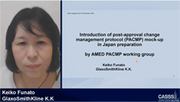 グラクソ・スミスクラインの船戸恵子氏からは、国立研究開発法人日本医療研究開発機構(AMED)のPACMP working groupにて作成中の国内申請用PACMPモックアップ文書が紹介されました。このモックアップ文書は海外のPACMPを参照しつつ日本の変更手続き制度を反映したものであり、その構成・内容についてAMED WG内での議論も踏まえた説明がありました。