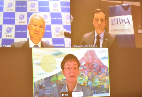 製薬協(JPMA)は2021年5月17日(月)、米国研究製薬工業協会(PhRMA)、欧州製薬団体連合会(EFPIA Japan)とともに、オンラインにて共同記者会見を開催しました。これに先立って同日に行われた、厚生労働省・内閣府・文部科学省・経済産業省との「革新的医薬品創出のための官民対話」にて、3団体は「骨太方針2021」や「医薬品産業ビジョン2021」策定に向けた提言をしており、その内容を報道関係者に向けて説明しました。